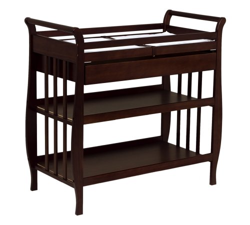 This elegant sleigh changing table has beautiful curves that will be a timeless piece to add to any nursery. It includes a 1" waterproof changer pad, safety strap, two shelves, and a drawer for added storage. Made of Pine wood. Features: Emily changer has the beautiful sleigh style design that is very popular. Safety belt and metal support under changer top enhances the safety of the changer. 1" waterproof changing pad included for additional comfort for your baby. Extra drawer under changer top for additional storage space. Made of Pine and wood composites. Finish: Espresso 1 Year Warranty