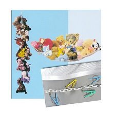 This is easy way to keep toys off the floor and out the way when not being played with. It is a neat, attractive, functional way to store toys. It also comes with a bonus chain to hang toys, stuffed animals, hats, etc.